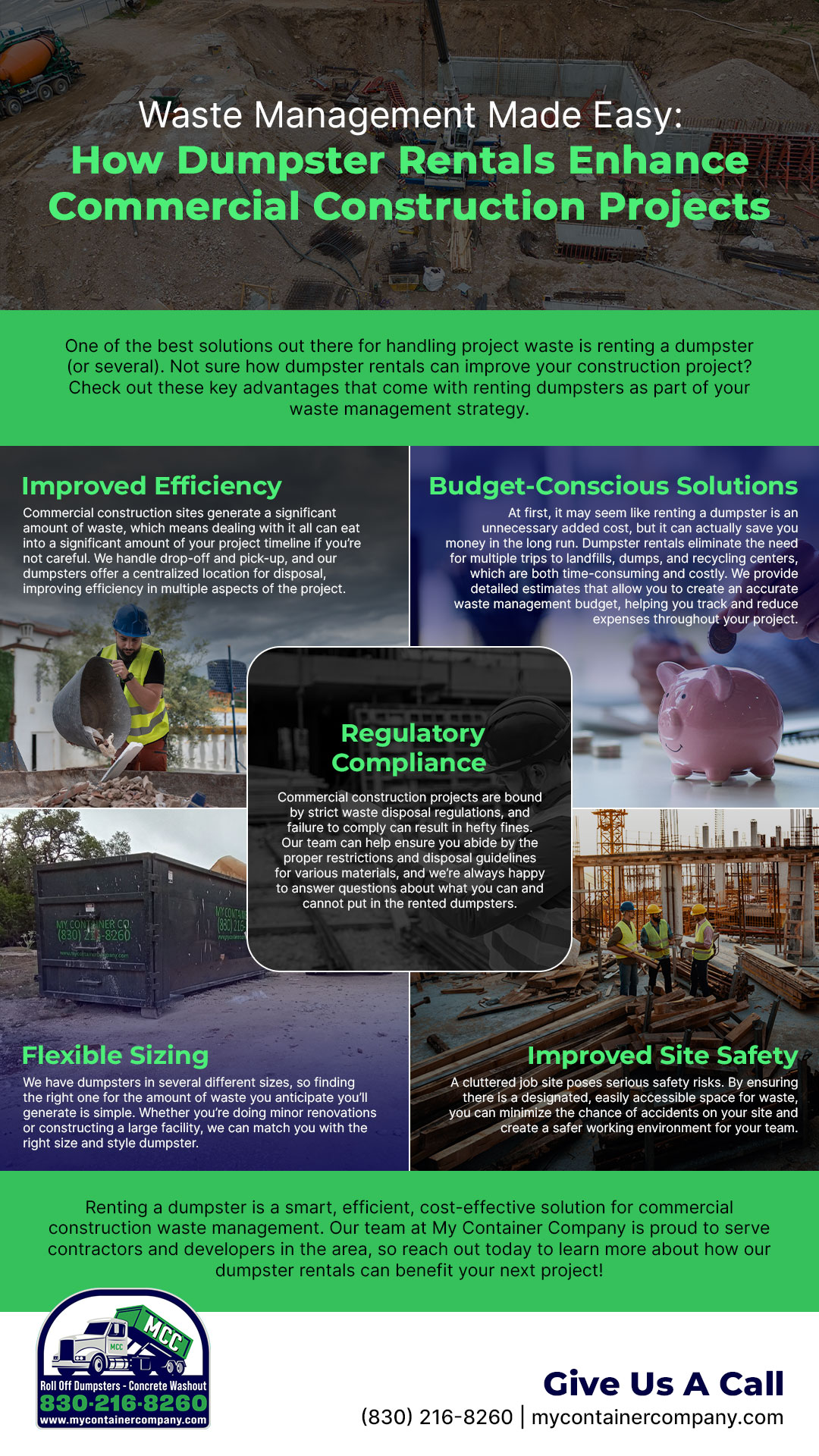 The construction dumpster often goes unnoticed in the grand scheme of building projects. However, these containers are essential for many reasons. Our team at My Container Company not only understands the value of construction dumpster rental for you and your team, but we also know that you need efficient and reliable service to keep your site looking its best.